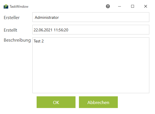 , um eine neue Aufgabe zu öffnen. Das aktuelle Datum wird bei „erstellt am“ und der aktuelle Benutzer wird als Ersteller in die Aufgabe eingetragen. Die Beschreibung kann frei ergänzt werden. Durch klicken auf den Button „OK“ wird die Aufgabe gespeichert. Mit Klick auf den Button „Abbrechen“ wird das Erstellen der Aufgabe abgebrochen.