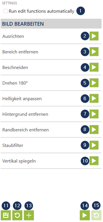 Alle Bearbeitungsfunktionen sind optional und in der Reihenfolge frei konfigurierbar. Auch das mehrfache Hinzufügen ist möglich. Um eine Bearbeitungsfunktion bearbeiten zu können klicken sie auf diese. Die Optionen werden unter dieser ausgeklappt. Klicken Sie erneut um diese wieder einzuklappen.
