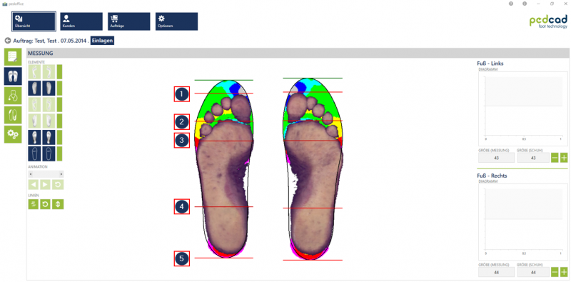Wenn Sie sich im Bereich „Messung“ eine Einlage und einen Rohling anzeigen lassen, werden Ihnen zusätzlich Linien auf der Einlage angezeigt (Abb.1 Nr.1-5). Auf der rechten Seite bekommen Sie ebenfalls die Größe der Messung angezeigt, die Schuhgröße können Sie anhand der Buttons