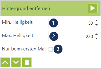 ![]() | Hintergrundfarbe basierend auf der Helligkeit eines Pixels auf weiß setzen. Nur Werte, die kleiner als der untere Grenzwert und größer als der oberen Grenzwert sind, werden zu weiß geändert. | Min. Helligkeit | Angabe nach RGB Wertebereich ist 0 bis 255 |