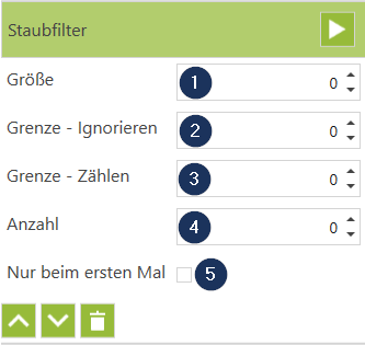 ![]() | Entfernen alle Artefakte um die Füße. Dabei wird geprüft, ob die Helligkeit eines Pixels kleiner als der Ignorierenswert ist. Wenn ja, wird um den Pixel herum nach weiteren Pixeln gesucht, deren Helligkeit über dem Zählwert liegen. Wenn genügend Pixel vorhanden sind, wird der Pixel auf weiß gesetzt. | Größe | Maximale Größe von Artefakten die entfernt werden in Pixel. |